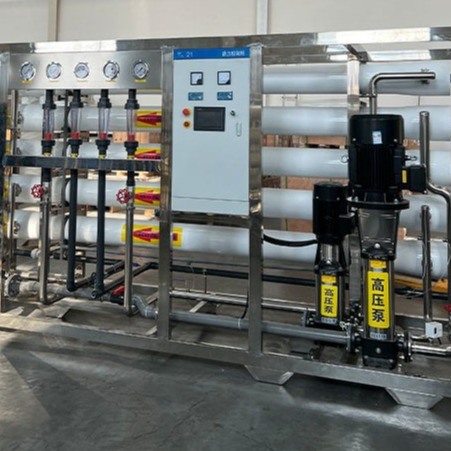 Original water tank -- original water pump -- quartz sand filter -- activated carbon filter -- scale inhibition feeding device -- security filter -- primary high pressure pump -- primary RO reverse osmosis system -- secondary high pressure pump -- secondary RO reverse osmosis system -- pure water tank